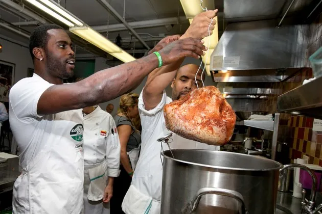 左起,厨师詹姆斯·布里斯科尼、喷气机后卫威利·科隆和迈克尔·维克摄影:烹饪教育学院