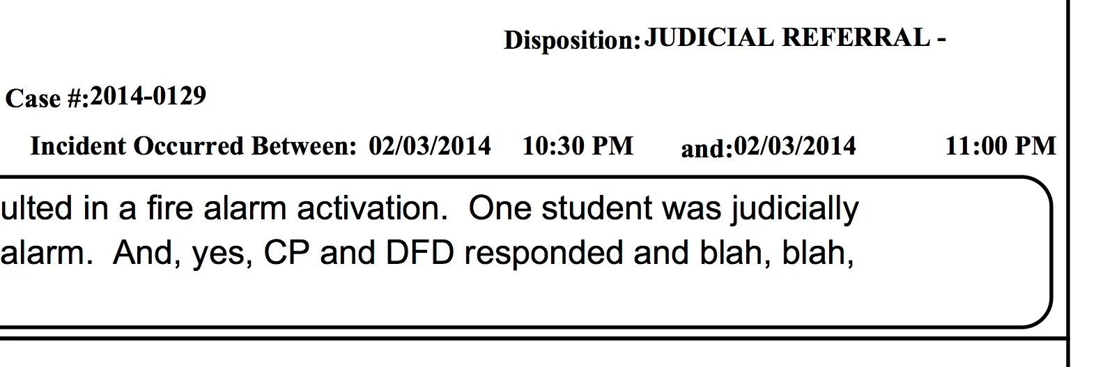 沟通解决一切,第二部分。 “校园警察与两名学生谈论了一起事件,其中一名学生认为这是恶作剧。另一名学生并不认为这是恶作剧。很好的讨论。”——4月26日