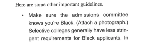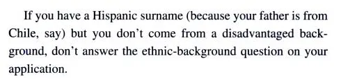 西班牙裔学生只收到两段建议,并被告知,“一般来说,针对非裔美国人的指导方针也适用于你。”这本书警告富裕学生在申请中不要过于强调他们的种族,称“如果你来自墨西哥的富裕家庭,你可能无法伪装成少数族裔。”