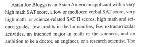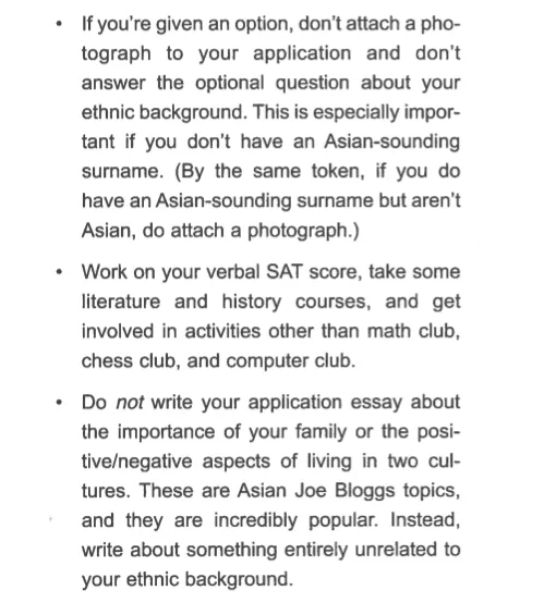 对于亚裔美国人或不是亚裔但有亚裔姓氏的申请者,这本书建议,“你需要避免成为一个亚裔乔·布洛格斯,”他们描述的学生在数学和科学方面很强,但在语言测试和人文学科方面较弱。(这本书没有解释这个奇怪的姓氏。)