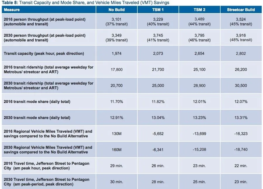 加维乐观的一个重要原因是阿灵顿已经评估了哥伦比亚派克的潜在增强公交线路,早在2012年,作为电车的一个可能替代方案。(报告将公交概念称为TSM-2,供那些计划自己深入研究的人参考。)回顾今天的分析,数据显示BRT风格的服务在流动性方面几乎可以与电车一样有效,而成本却低得多。