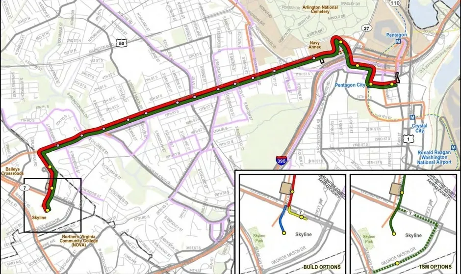 2012年对哥伦比亚派克交通替代方案的分析显示,电车和增强公交选项共享相同的路线。阿灵顿县在系统设计方面,这两个概念几乎是相同的。电车和增强公交都将在阿灵顿的五角大楼城市沿哥伦比亚派克行驶五英里,直到邻近的费尔法克斯县的贝利十字路口。提议的停靠位置相同,车站风格也相同——设有高架站台、车外收费、全门上车和实时交通数据。两个服务在高峰时段每两到三分钟运行一次。
