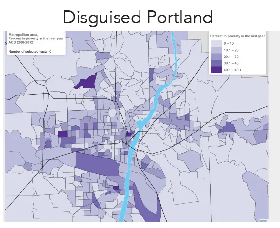 格里芬想知道可视化这种关键不确定性信息的地图如何帮助规划者做出更明智的决策。她和同事塞斯·E·斯皮尔曼、尼古拉斯·T·纳格尔、杰森·尤尔杰维奇、梅格·梅里克和大卫·C·福尔赫测试了一组来自俄勒冈州波特兰的55名城市规划者,进行了一项与正常工作实践非常相似的任务:他们查看了波特兰的贫困地图,并被要求选择贫困水平最高的社区群体,这些社区将获得额外的城市服务。以下是控制地图,其中不包含关于每个社区贫困百分比的误差范围信息: