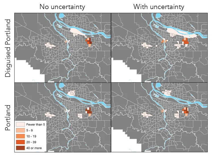 他们还测试了表示不同不确定性度量的地图,“变异系数”,以及有趣的是,测试所有这些变量但显示“伪装”波特兰的地图。