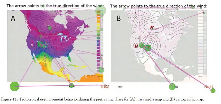 然后,进行测试:三十名受试者被要求判断地图上放置的箭头是否指示了风的正确方向(在这张地图中,可以通过研究风压线来确定)。研究人员使用眼动追踪软件测试受试者花费多长时间来找出答案,以及他们的准确性。