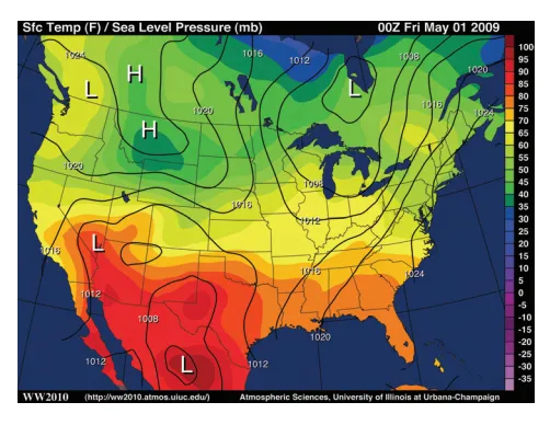 法布里坎特工作的一个很好的例子是研究NOAA熟悉的天气地图,正如她的论文中所提到的,这些地图通常不是由制图师设计的。请看下面的NOAA地图,它代表了两个关键数据集:温度(通过颜色表示)和海平面气压(通过黑色轮廓表示)。