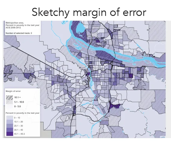 然而,美国社区调查(ACS)提供的数据存在显著的误差范围——大约是十年数据集的1.25倍——因为它是从相对较小的群体中收集的。