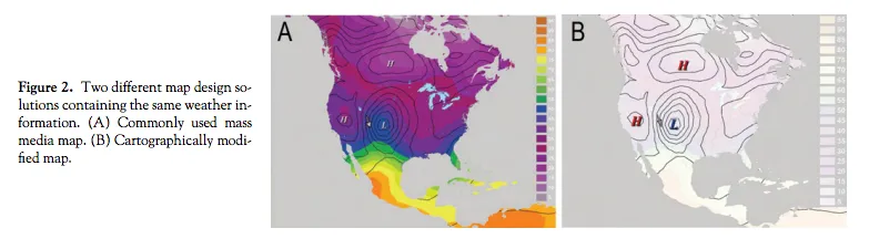 但法布里坎特想要验证视觉主导性与主题重要性之间的相关性。因此,她和她的同事们创建了两种天气地图:一种受NOAA大众媒体天气地图的启发,另一种由她和她的团队重新设计,如下所示。这些地图表示相同的信息集——温度和风压——但它们的视觉变量不同。在大众媒体地图中,温度具有更强的主题强调。在法布里坎特的地图中,风压则更为突出。