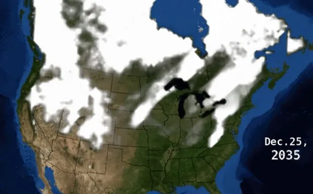 泰勒依赖的模型 CanRCM4 在这个世纪生成了一些有趣的趋势。气候变化的影响显而易见,积雪不断向北退去,就像秃顶的圣诞老人白色的发际线。在这个总体模式中,泰勒称之为“几年的降温,然后几年的升温的小周期”。还有几个神秘区域,雪或荒芜顽固地存在。