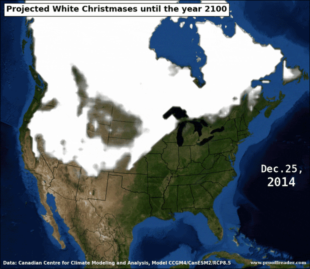 这是一个荒谬的问题——而现在它已经得到了大卫·泰勒的回答,他是一位44岁的数据科学家和作家,居住在蒙特利尔,他制作了一个预测白色圣诞节的动画,涵盖了本世纪剩余的每一年。