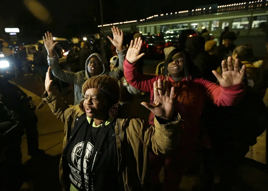 巴巴拉·琼斯与其他抗议者一起,在2014年11月24日星期一,在密苏里州弗格森市举起双手。美联社照片/查理·里德尔