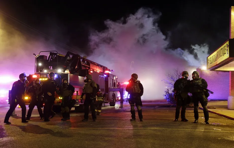 烟雾弥漫街道,一些建筑物着火,时间是2014年11月24日星期一,地点在密苏里州弗格森市,陪审团决定宣布后。美联社照片/杰夫·罗伯森