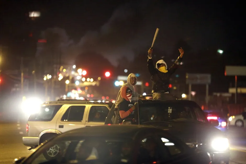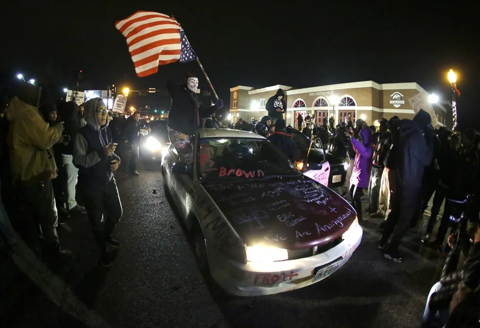 抗议者在2014年11月24日星期一,弗格森市陪审团决定宣布后四处游荡。美联社照片/大卫·戈德曼