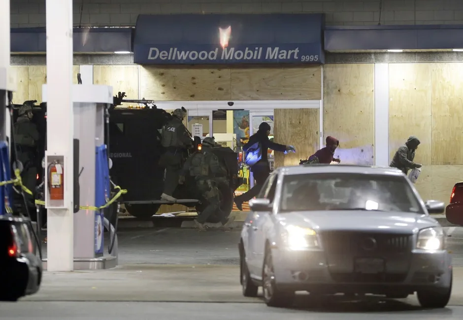 人们在2014年11月25日星期二,当警察到达时,从加油站跑出来,手里拿着货物,地点在密苏里州弗格森市。美联社照片/大卫·戈德曼