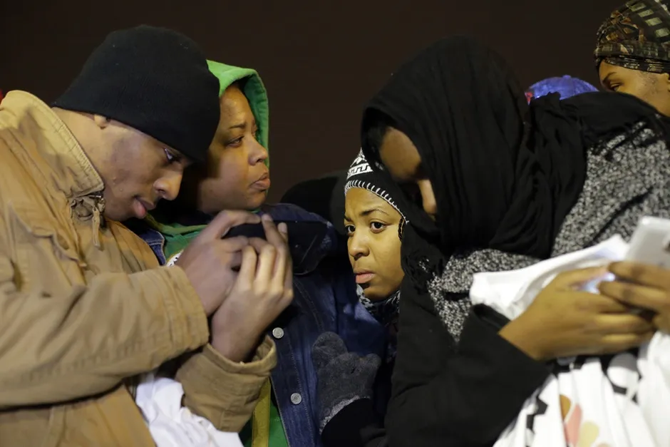 抗议者在2014年11月24日星期一,在密苏里州弗格森聆听大陪审团决定的公告。大陪审团决定不对弗格森警察达伦·威尔逊在无武装的黑人18岁青年迈克尔·布朗死亡一案中提出起诉,迈克尔·布朗的致命枪击引发了有时暴力的抗议。美联社照片/查理·里德尔