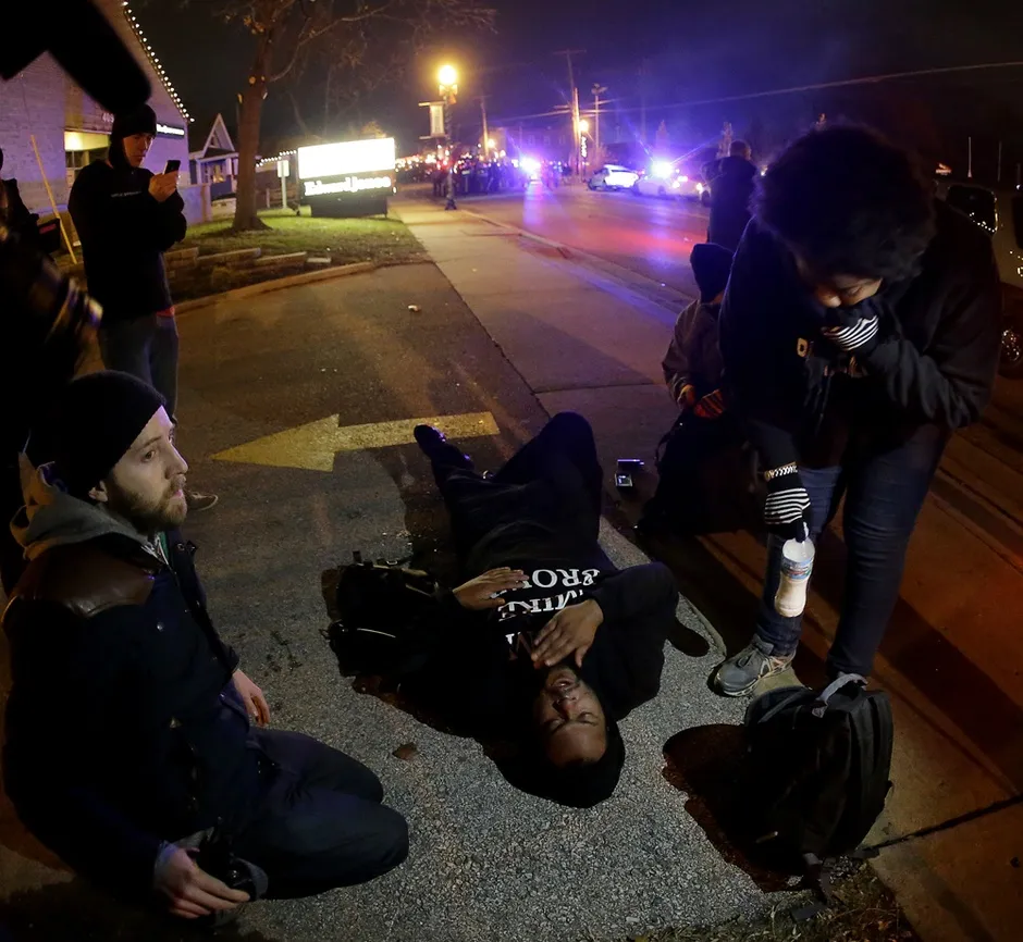 一名男子在警察使用催泪瓦斯驱散抗议者后,试图在2014年11月24日星期一,在密苏里州弗格森警察局前恢复呼吸,因大陪审团决定不对警察达伦·威尔逊在致命枪击无武装黑人18岁青年迈克尔·布朗一案中提出起诉。美联社照片/查理·里德尔