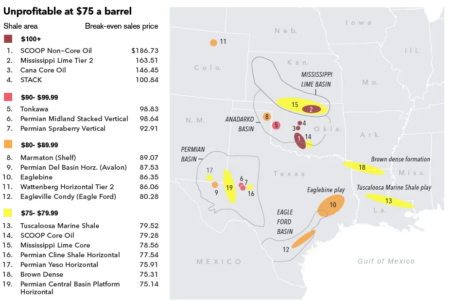 沙特人完全愿意看着油价继续下跌,以看看他们是否能将一些美国公司逼入困境。因此,游戏变成了他们能降到多低。最近的分析来自彭博新能源财经,发现德克萨斯州、俄克拉荷马州、路易斯安那州、堪萨斯州和阿肯色州的19个地区在每桶75美元时停止盈利。这大致就是目前的情况。