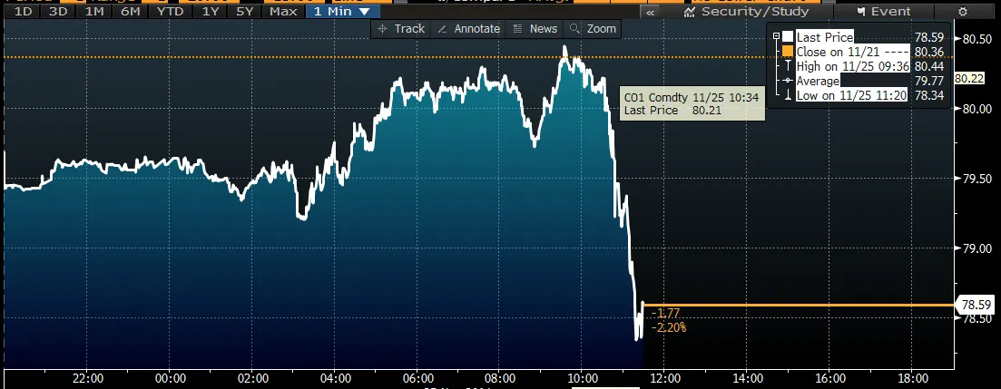 截至11月25日星期二早上,交易员们开始押注OPEC在星期四所做的任何减产最多也将是有限的。布伦特油价在中午的消息中暴跌,消息称委内瑞拉、墨西哥、沙特阿拉伯和俄罗斯的会议 未能达成 协调减产的协议。