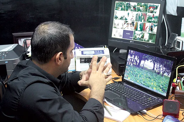 哈拉比监控着16个屏幕,观察他的员工切鸡肉、操作油炸机和准备三明治摄影:阿巴斯·杜勒为《彭博商业周刊》拍摄