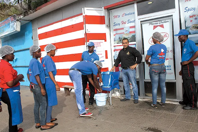 当病毒开始在蒙罗维亚传播时,采取了更多的预防措施。在餐厅外放置了一个装满氯和水混合物的桶,供顾客和员工洗手,工人的体温每天都会被测量,不锈钢工作台之间的间距被拉开以减少员工之间的接触,顾客离开后,桌椅会用氯和水的混合物擦拭。哈拉比检查了为他的三明治生产面包的面包店的水源,并确保工人在处理面包或面团时佩戴手套。Monroe Chicken已经在清洗蔬菜时使用了一点氯。