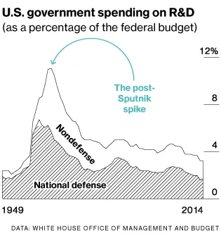 美国公共研发支出的增加与肯尼迪总统在1961年承诺将人送上月球的决定相吻合。在奥巴马总统任内,他并没有提出任何类似雄心勃勃的目标。在某些情况下,私人行业(约占美国研发投资的三分之二)已经介入:亿万富翁埃隆·马斯克和理查德·布兰森投入数百万美元开发商业航天旅行,因为NASA已停止其航天飞机项目。