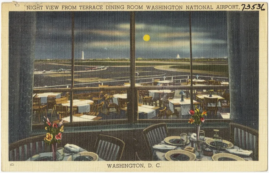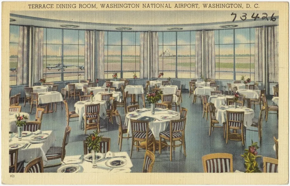 华盛顿国家机场的露台餐厅。Flickr/波士顿公共图书馆超过三百五十万美国人将在这个感恩节飞上天空,我敢打赌,很少有人期待这次旅行。如今的航空旅行以延误、有限的腿部空间和无尽的、千篇一律的航空航站楼为特征,这让纽约看起来像明尼阿波利斯,明尼阿波利斯又像维也纳,维也纳又像洛杉矶国际机场。