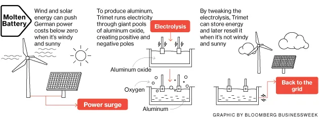 Trimet通过电解法将铝土矿转化为铝,电解法是利用电流刺激化学反应。罐中的负极和正极将化合物分离为铝和氧。电极与沉淀在罐底的液态金属和上方的氧气共同形成一个巨大的电池,Trimet可以在电力便宜时从电网中吸收电力。然后,当需求达到峰值时,它可以将电力转售。