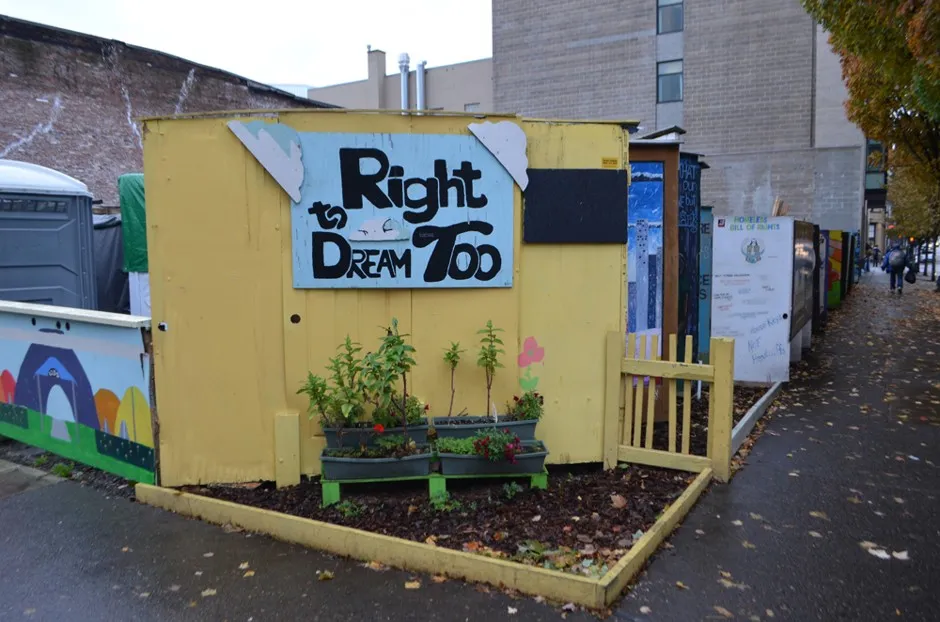 Right 2 Dream Too 是一个简单的帐篷城市。现场几乎所有的结构都是用塑料帆布搭建的。Right 2 Dream Too 是一个简单的帐篷城市。2011年在一个被办公楼包围的小停车场上建立,现场几乎所有的结构都是用塑料帆布搭建的,支撑着的是一堆杂乱无章的木头和金属杆。在停车场的后面有帐篷——大约20个,五颜六色的尼龙拼接而成,许多帐篷上覆盖着多层帆布,以抵挡波特兰无情的雨水。