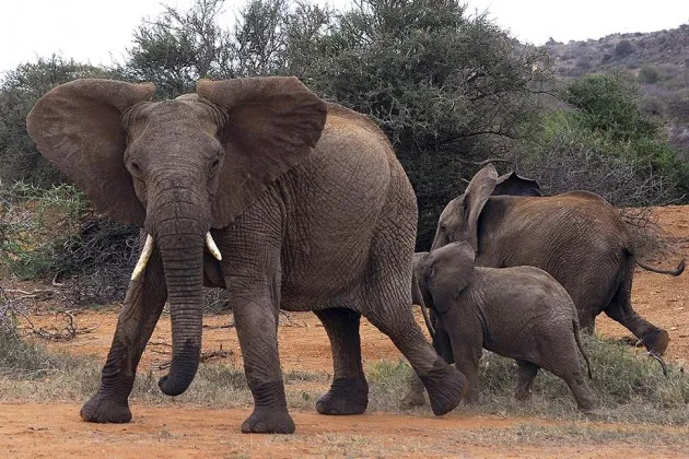 一群大象在8月6日于肯尼亚莱基皮亚县的奥尔乔吉犀牛保护区,当一辆车接近时的反应