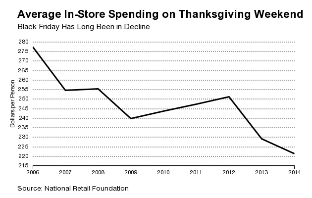 事实上,NRF的数据质疑了感恩节周末作为假日销售风向标的价值。即使在过去八年中有五年的感恩节周末销售下降,整体数字仍然在上升。有时这两个数字之间缺乏相关性的情况相当明显:例如,在2008年,假日销售在感恩节周末销售增长7%后下降了4.4%。 发生了什么?部分原因是,媒体普遍呈现的黑色星期五正在变得过时。考虑到人们在感恩节晚上在百思买和沃尔玛露营的关注度,你可能会认为这是一项越来越受欢迎的活动。然而,根据NRF的数据,感恩节周末的店内销售在过去十年中一直在下降。