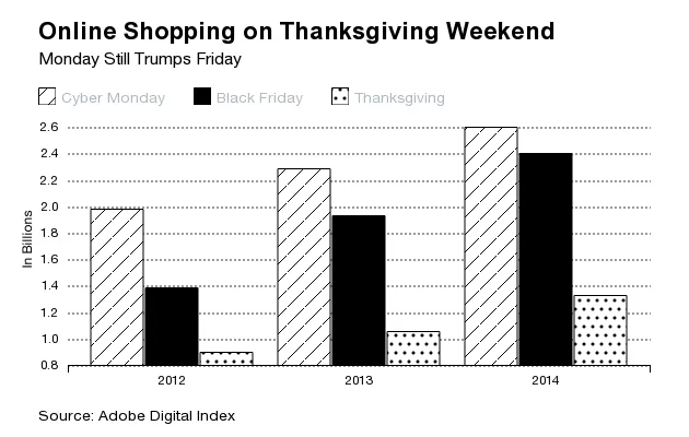 当然,购物的庆祝活动还没有结束,网络星期一被寄予了比假期周末的任何一天产生更多在线销售的期望。因此,其他消费者追踪机构对电子商务得出了更乐观的结论:ComScore表示 感恩节的在线购物增长了32%,与2013年相比,而黑色星期五则增长了26%。不过,无论最终统计结果如何,都有理由质疑这个周末的神秘重要性。
