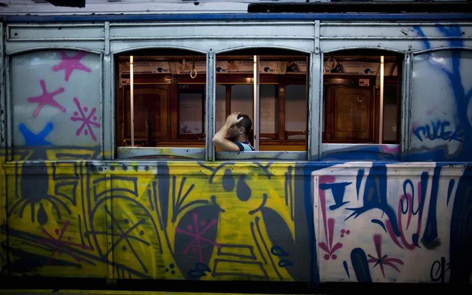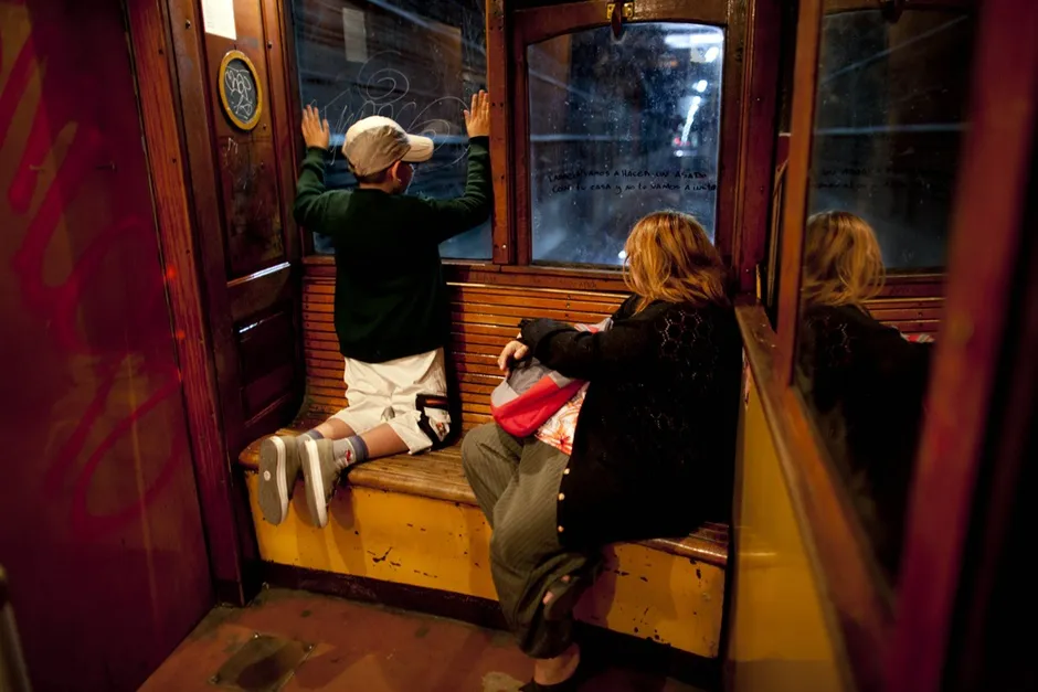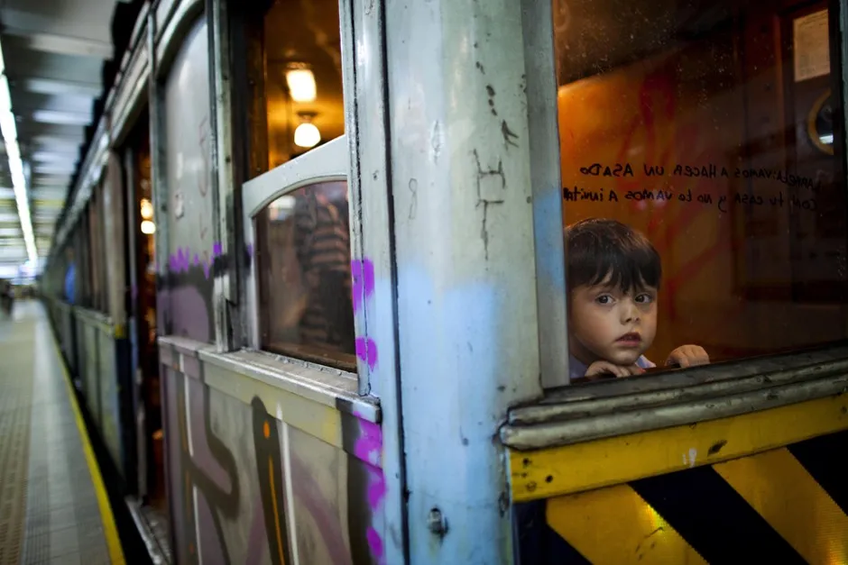 一个孩子透过阿根廷布宜诺斯艾利斯历史悠久的地铁系统A线的木制车厢窗户向外看,时间是2013年1月2日,星期三。美联社/娜塔莎·皮萨伦科南美洲第一条地铁系统今天迎来了101周年。