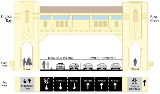 2009年的计划将一个车道改为自行车道,并重新利用了人行道。完整街道加拿大第三,温哥华愿景在媒体报道中塑造了更积极的形象,特别是在2009年7月13日试点启动时。出城车道的转换确保了第一天交通不会在桥上堵塞,提供了没有负面照片机会或对未来拥堵的猜测。与此同时,在试点之前,市官员通过广告、焦点小组和精心安排的社论向公众通报了这一变化。这里是西米亚提基和他的团队:
