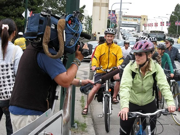 记者在2009年7月试验开幕日采访从布拉德桥下来的骑自行车者。Ariane Colenbrander / Flickr2009年的自行车道试验显然是成功的。在布拉德试验的前三个月,骑自行车的出行增加了26%(增加了70,000次)。行人喜欢没有骑自行车者的行人道。根据Siemiatycki等人的研究,汽车和公交车的旅行时间“相对没有变化”,这一发现与最近的证据一致,即自行车道 并不一定会影响交通速度。