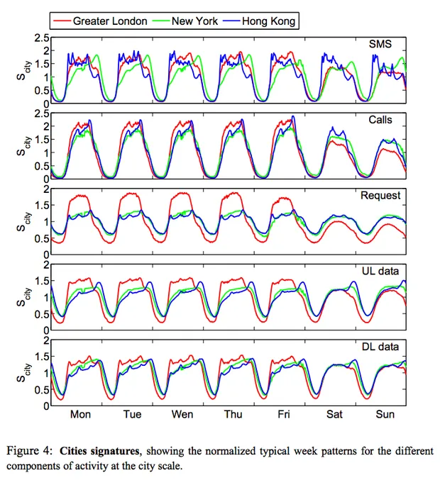 应用中四个城市中三个城市的城市通信模式显示,周活动的高峰和低谷是相同的。麻省理工学院SENSEable实验室论文但有一些特定城市的观察。例如,美国人在晚上发短信更多,而在伦敦,活动在圣诞节期间显著下降。通过使用事件日历、地理定位的推文、天气和交通报告以及房地产价格来查看这些趋势在当地文化和经济背景中的表现,可以帮助解释它们。