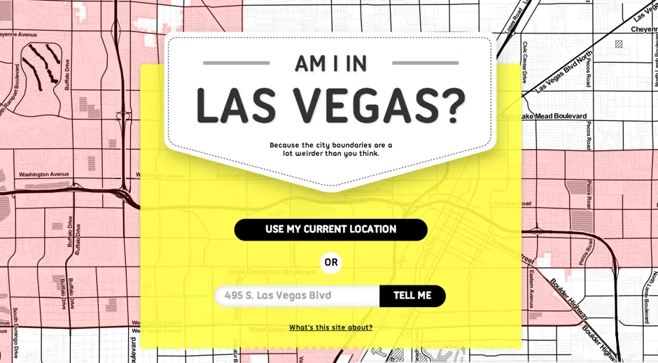 彭博社城市实验室休斯顿附近的管道火灾迫使一些居民撤离布达佩斯旅游区投票禁止类似Airbnb的租赁“购买美国”争端危及从拉斯维加斯到洛杉矶的时速200英里铁路一位艺术家重新构想童年的空间,结果却充满荆棘因此,尽管这座城市的标志性灯光和高度,实际上很难知道你是否真的在拉斯维加斯。幸运的是,现在有一张地图,恰如其分地命名为“我在拉斯维加斯吗?”开发者Lou Huang、Ryan Closner和Lindsay Ballant与拉斯维加斯市合作创建了这个简单的在线工具,你可以输入一个地址或显示你的位置,以获得一个令人愉快的简单“是”或“否”的回复。
