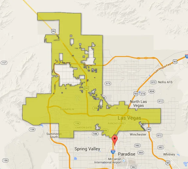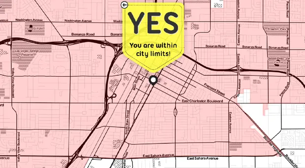 然而,旅行者如果只在贝拉吉奥附近或麦卡伦机场附近活动,实际上根本没有真正到达拉斯维加斯。拉斯维加斯大道实际上距离拉斯维加斯市区稍微超过一英里,而市界也排除了市内的大块土地。查看一份 拉斯维加斯的官方地图,可以看到令人震惊的界限(贝拉吉奥的定位):