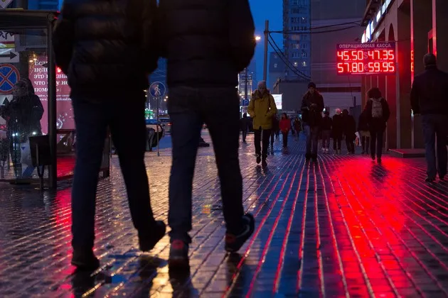 莫斯科一家外汇局外张贴的外币汇率摄影:安德烈·鲁达科夫/彭博社俄罗斯经济的警告灯正式亮起红色。克里姆林宫首次承认该国将在2015年初进入衰退,因为经济在当前季度停滞。政府还宣布将不得不动用储备来满足明年的预算,而一家主要国有银行的负责人警告称,国家银行系统可能会出现恐慌。