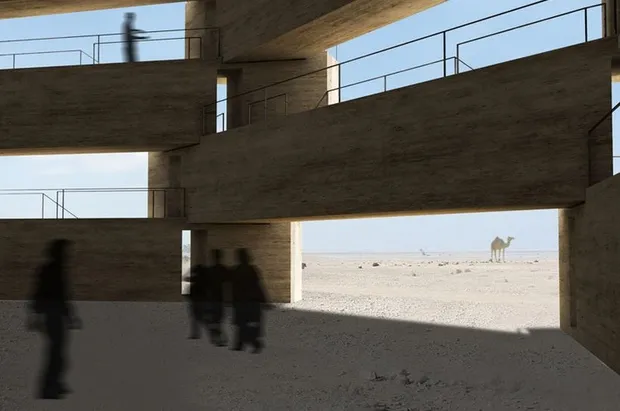 所有这些人类的毁灭难道就不值得纪念吗?法国/智利的实验建筑机构一周一项目认为不应该。他们设计了一个可能是最阴郁和最不微妙的纪念碑:在杀戮沙漠中矗立的高耸城堡,由巨石构成,每块石头代表一名失去的尼泊尔工人。(大约一半的卡塔尔世界杯劳动力来自尼泊尔和印度。)