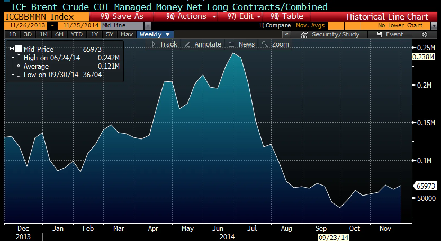 大部分抛售发生在9月底之前。投机者仍然是净多头,这意味着集体预期价格将会上涨。实际上,上周在OPEC决定不减产后,石油期货出现了上涨。