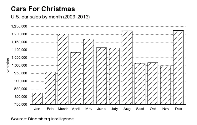 假日购物狂潮,然而,并不完全是出于对人类的善意。这在很大程度上是由行业制造和销售汽车的方式驱动的。在12月,大多数经销商正在清理当前年份车辆的最后库存,以为明年的车型腾出空间。他们还在拼命提高收入并实现年度销售目标。这两种动态加起来为司机带来了大幅折扣。在2013年12月,汽车买家在平均车辆上获得了2463美元的激励,几乎占典型标价的8%。只有在5月和6月,交易稍微好一些。