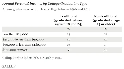 盖洛普调查了大约4000名非传统毕业生和7500名传统毕业生,所有人都在1990年至2014年间获得学位。只要他们在大约相同的时间毕业,两组之间的收入没有显著差异。