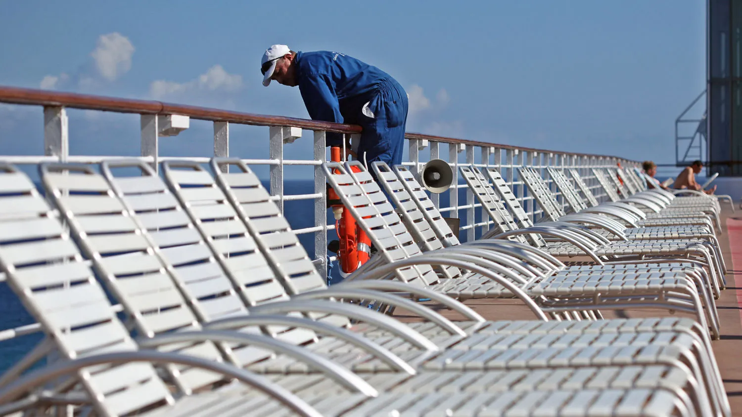 一名工人在2012年12月17日星期一,停靠在牙买加法尔茅斯的名人星座号邮轮上,俯身靠在栏杆上。