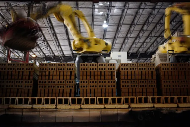机器人在阿拉巴马州利兹的阿克梅砖公司堆叠新切割的砖块,时间是11月21日摄影:卢克·沙雷特/彭博社根据美国经济分析局今天发布的数据,美国制造产品的贸易逆差在10月份达到了712亿美元(pdf)。这是有史以来最高的,博客作者艾伦·托内尔森表示,他汇编了政府数据。年初至今的逆差比2013年高出12%,托内尔森表示,这使得它有望创下年度记录。