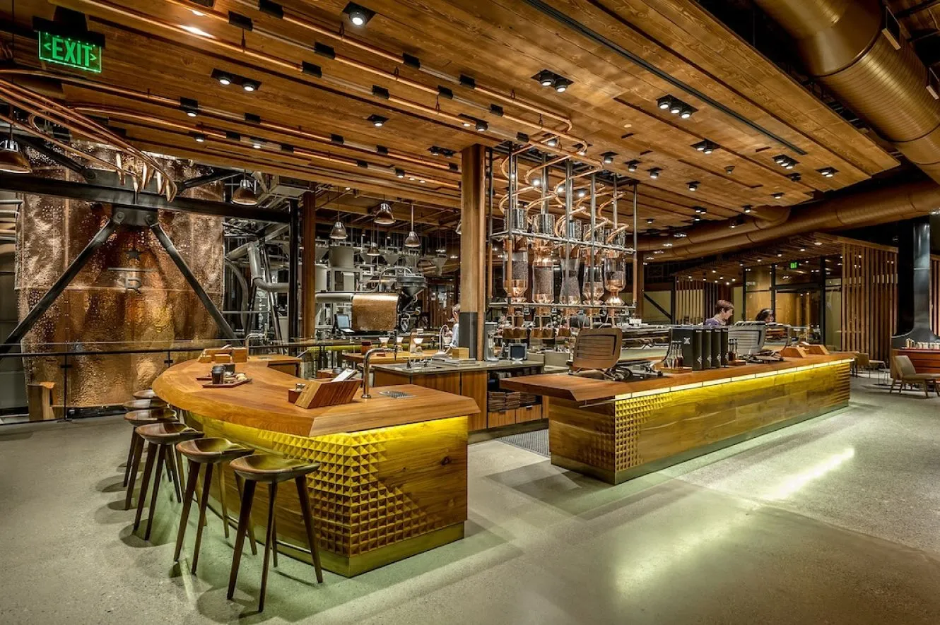 新咖啡馆将专门烘焙和提供超高端的Reserve系列咖啡,而不是提供像派克市场这样熟悉的品种。该设施本身是一个前汽车展厅,拥有15000平方英尺的宽敞空间,装饰着丰富的木材和铜质装饰。游客可以观看绿色咖啡豆被倒入一个巨大的铜锅中,烘焙成棕色,然后通过天花板上的管道吸入透明的咖啡筒中,用于饮品制作。