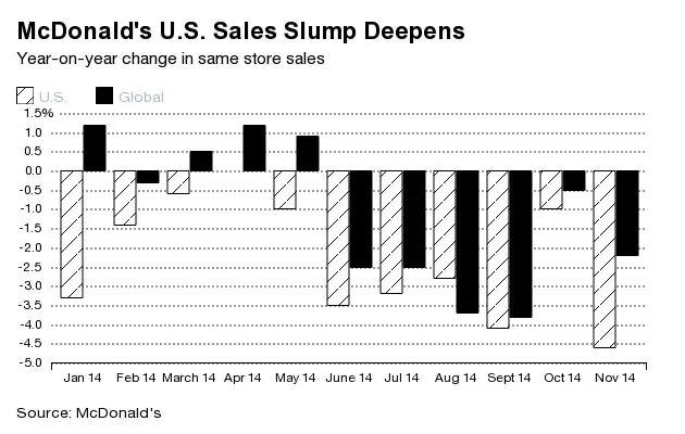 这家汉堡连锁店在12月8日早上报告称,11月份美国的同店销售额下降了4.6%——这是十多年来最大的降幅——全球下降了2.2%。自2013年10月上涨0.2%以来,麦当劳在美国的同店销售额一直没有正增长。