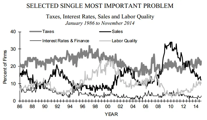 调查询问小企业主他们现在面临的最大问题是什么,查看答案总是很有启发性。如果你查看下面的图表,表示“税收”是他们最大问题的公司比例普遍上升。