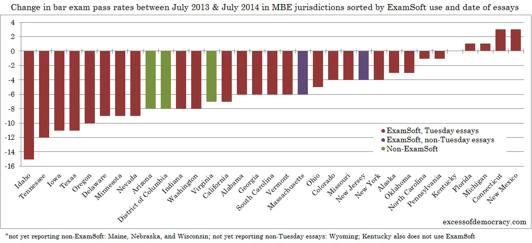 尽管如此,一些院长和法律专家正在提出关于历史性糟糕结果的初步理论。佩珀代因大学的法学教授Derek Muller表示,他测试并拒绝了所有与考试本身无关的解释。Muller将LSAT分数与律师考试分数进行了比较,发现今年的法学院毕业生的表现应该只比去年稍差。他还拒绝了一个Examsoft软件故障可能造成差异的想法,因为没有使用Examsoft的州,如亚利桑那州和弗吉尼亚州,仍然看到他们的通过率下降。“通过排除法,我正在耗尽替代解释,越来越多地将NCBE视为一种可能性,”他说。