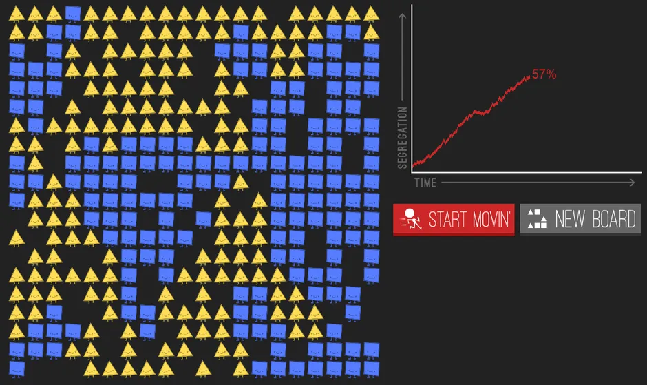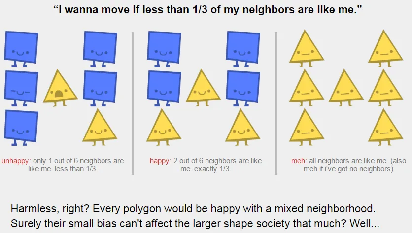 这是一个隔离的形状社会。这仅仅是33%的偏见——一个看起来相对较低的偏好。当偏见增加时,情况会变得更加严重。