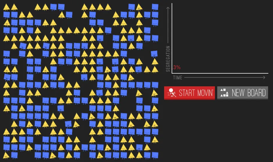 即使有“合理”的偏好,即33%或更多的邻居看起来像他们,这些形状也不会感到快乐,直到分隔看起来相当明显。这是一个杂乱的33%形状偏见的网格。有些是“快乐”的,有些则迫切想要移动:
